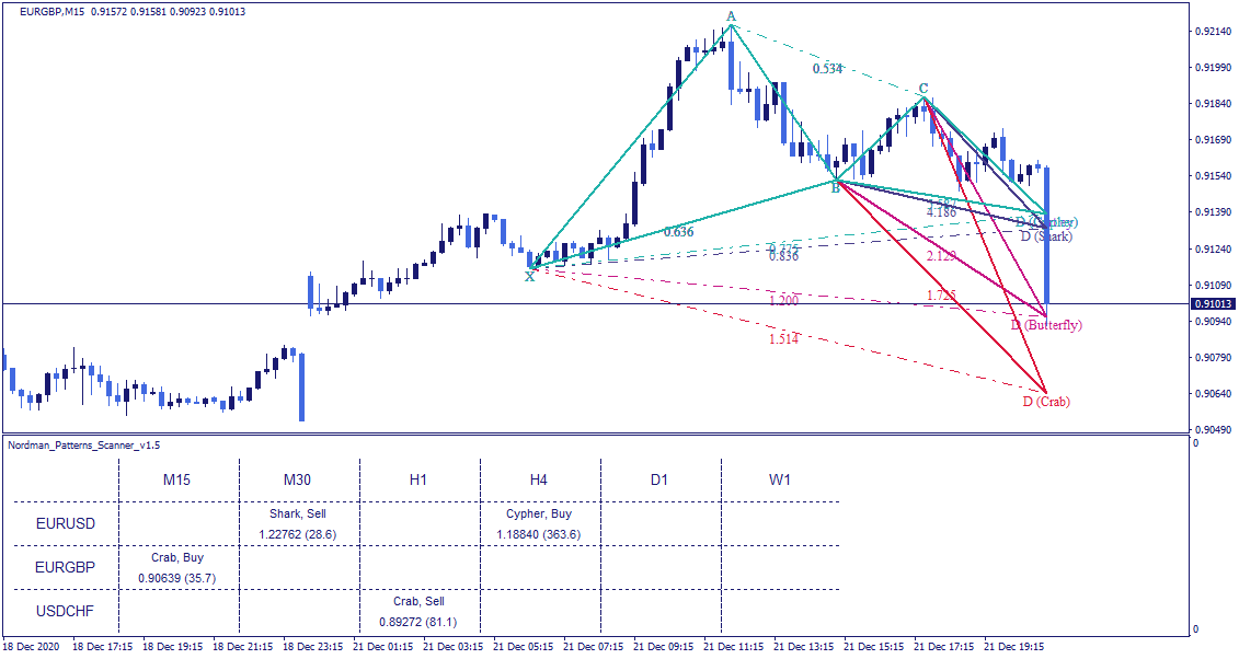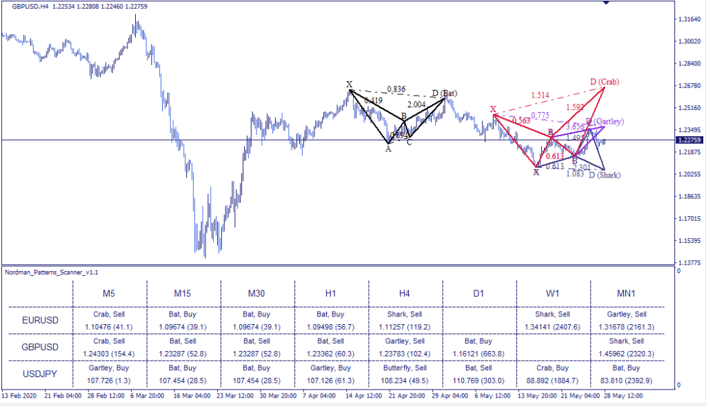 The scanner identifies the most popular among traders harmonic patterns, which are recognized as universal and can be applied to all markets and time intervals. Each pattern has bullish and bearish versions, which determines the direction of a trade (buy or sell):