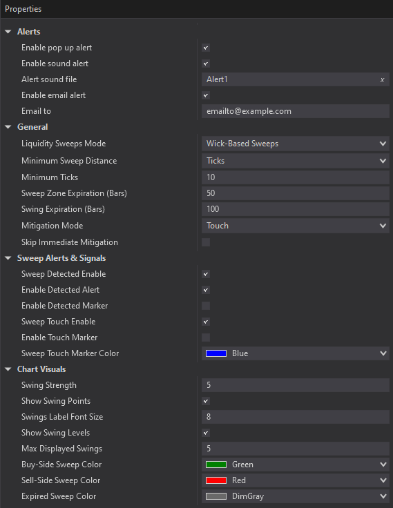 The NinjaTrader Liquidity Sweeps Indicator provides practical and convenient tools, allowing traders to adjust settings for different trading styles and approaches. These features include: