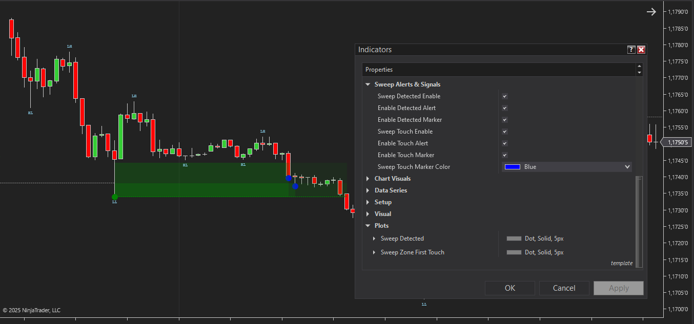 The indicator generates signals and alerts for confirmed sweeps and the first valid interaction with the sweep zone (Mitigation). All alerts can be individually enabled or disabled, allowing the indicator to be used purely as an analytical tool. Signals are also exposed via Signal Plots, enabling direct integration with NinjaTrader strategies and automated systems.