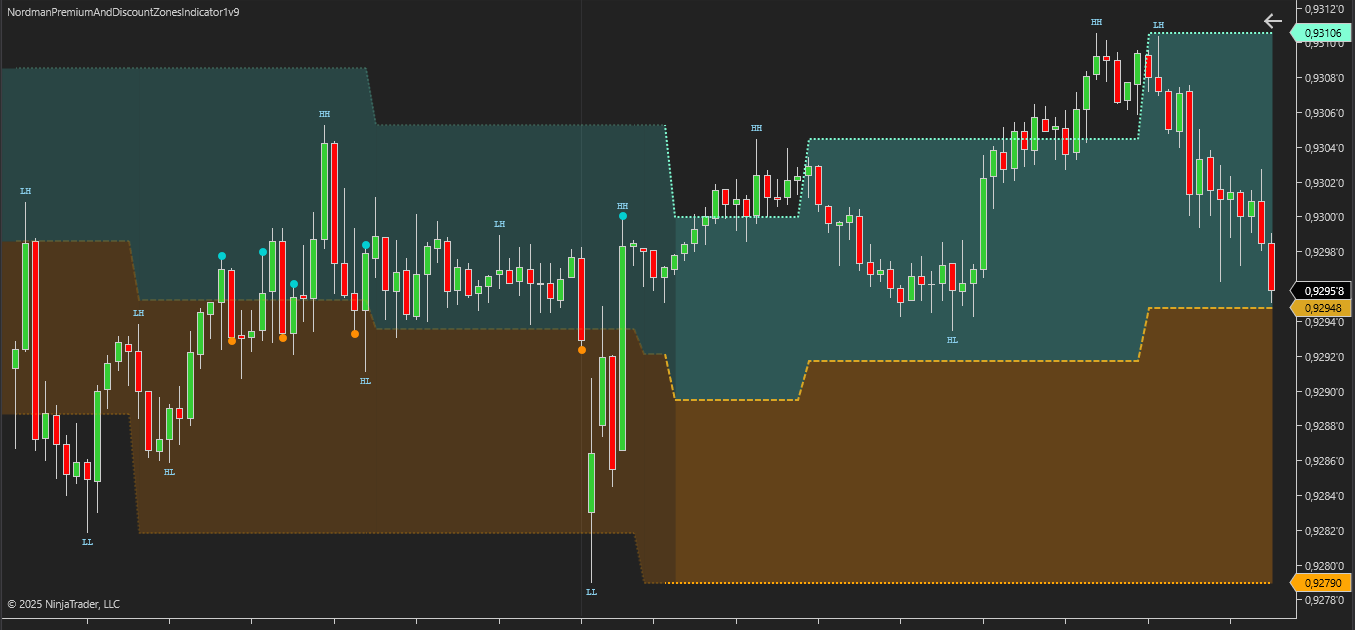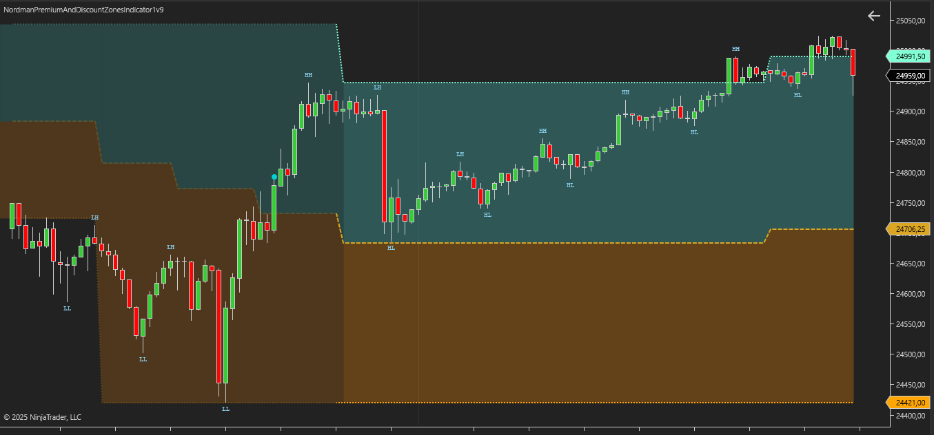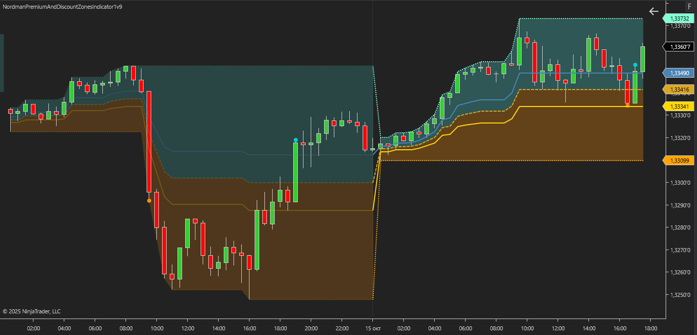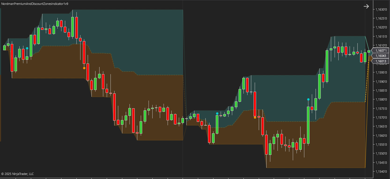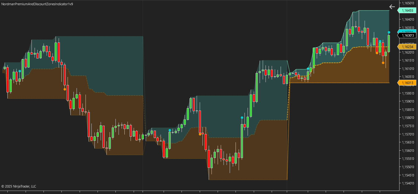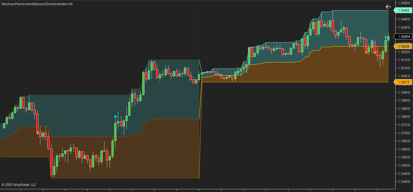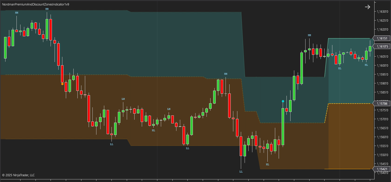 In this way, the NinjaTrader Premium & Discount Zones Indicator helps clearly identify whether an asset is trading at a premium or discount relative to its equilibrium, and use this context to find optimal entry and exit levels.
