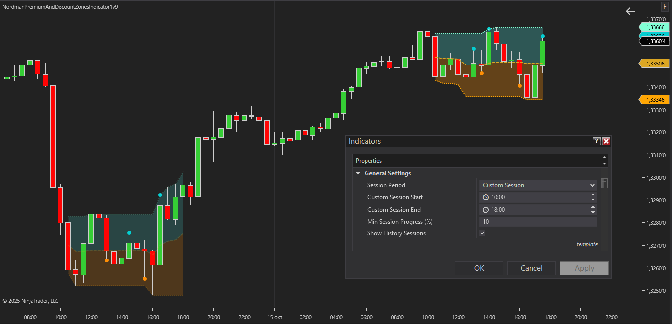 Show History Sessions – enables or disables the display of past zones built according to the selected range calculation type (Session, Day, Week, Custom Session, or Last Swing). If disabled, only the current zone is shown on the chart.
