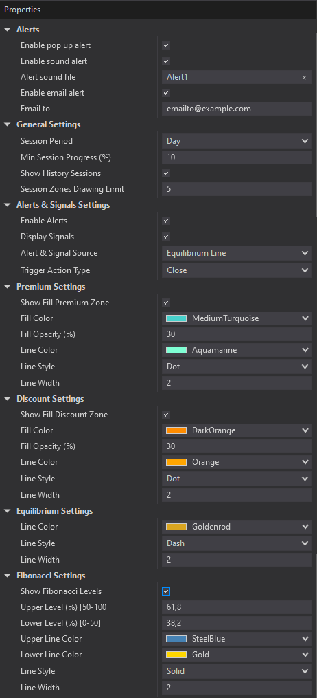 To improve clarity, the indicator offers extended visualization settings. Traders can adjust the colors of Equilibrium, Discount, and Premium zones, enable or disable zone shading, modify line colors and styles, and control transparency. This allows users to tailor the display to their personal workflow while preserving analytical convenience when combining with other indicators. Clear visualization enhances chart readability and supports faster, more confident trading decisions.