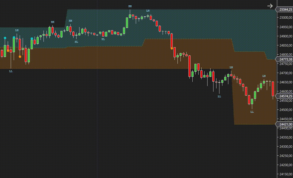 A key feature of this mode is that the range does not update immediately when price touches an extreme, but only after the swing has been confirmed. Zone updates on the chart occur only when the local high or low is validated according to fractal logic. This is controlled by the Swing Strength parameter, which sets the number of bars required to confirm a swing. Higher values increase the strictness of the filter: an extreme is recognized only if it is surrounded by a sufficient number of bars with lower highs (for a peak) or higher lows (for a trough). This approach reduces false zone updates and provides a more structured and accurate representation of market dynamics.